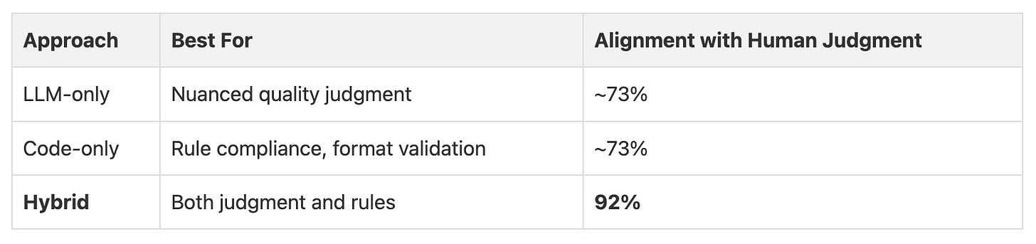 I found it was better to use the LLM for nuanced judgments and use code to enforce hard rules, and then use a weighted sum to calculate the final score. This brought the alignment with human judgment from 73% to 92%.