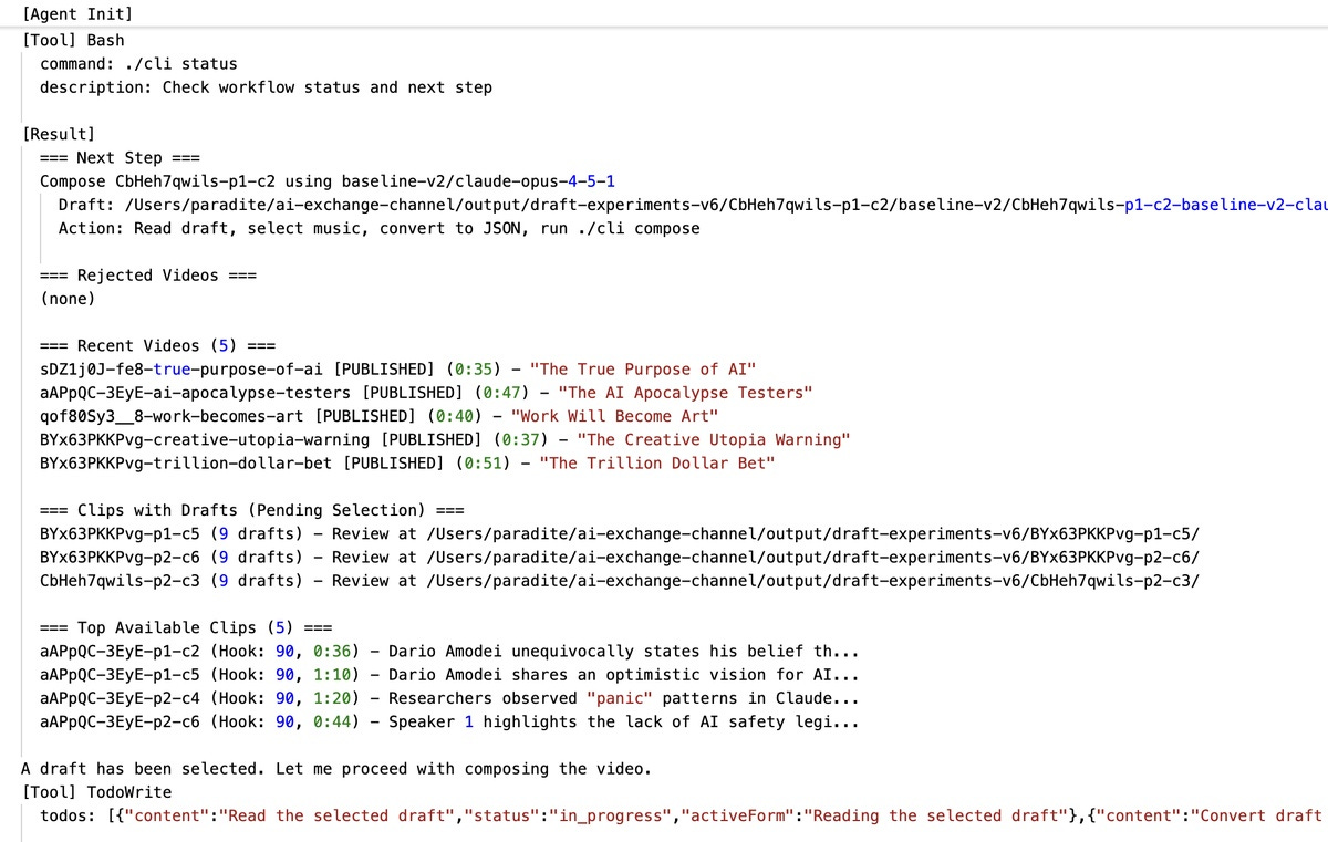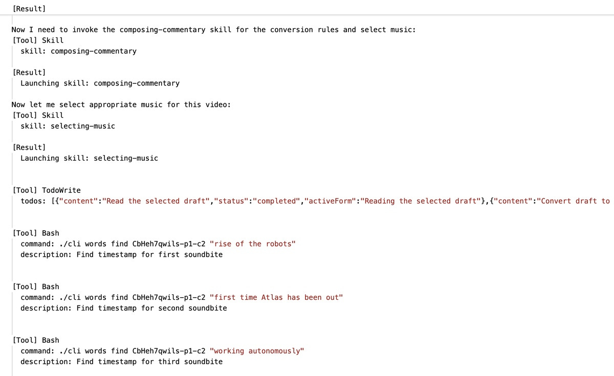 For example, the logs showed me that my agent was trying to compose a video three times before succeeding. The issue was an FFmpeg error that happened when too many video overlays were used. So I added a validation step to prevent this from happening again.