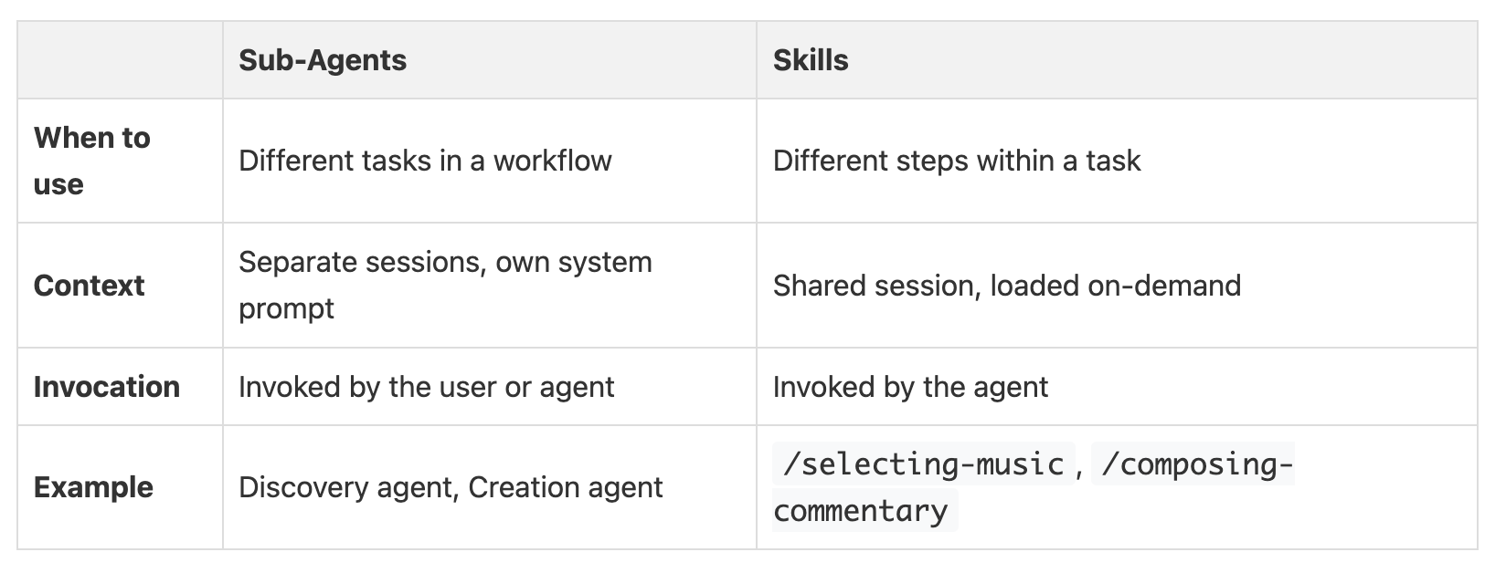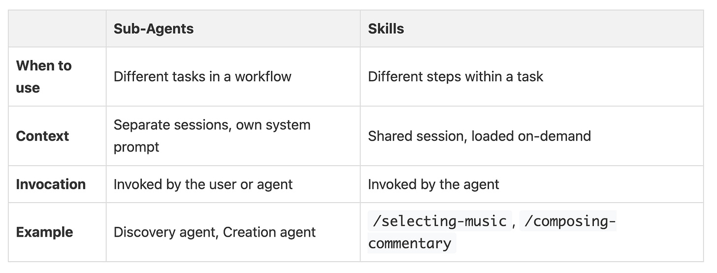 For smaller steps within a single task, I use skills. My video creation agent uses skills like /selecting-broll to find footage or /selecting-music to choose audio. These skills are loaded only when needed and share the context with the main agent.